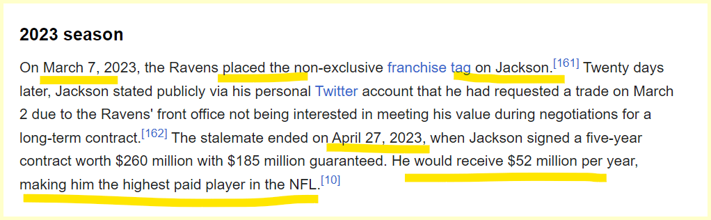 52 days after they placed a franchise TAG on him, he becomes the highest paid player for 52 million a year.
