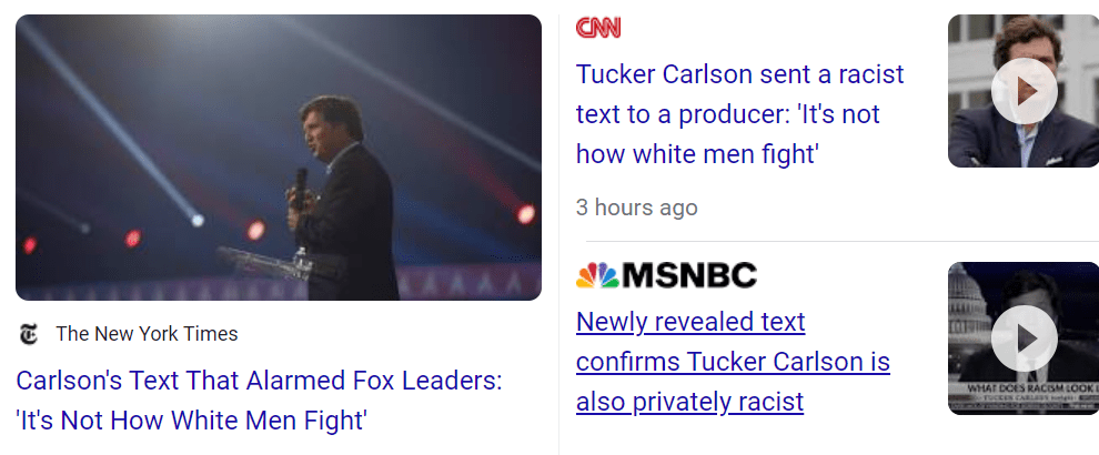 May 3, 2023 Tucker Carlson headlines over racist text from Jan of 2021 A conspiracy journalist puppet is headlined as a Racist This text came on Jan 7th 2021 GIVE KNOWLEDGE AND SHARE THIS! Click to share on Facebook (Opens in new window) Facebook Click to share on Telegram (Opens in new window) Telegram Click to share on X (Opens in new window) X Like Loading... Related