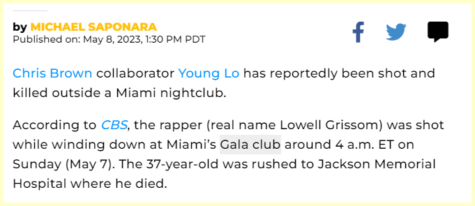 May 9, 2023 CHRIS BROWN COLLABORATOR YOUNG LO SHOT & KILLED IN MIAMI GIVE KNOWLEDGE AND SHARE THIS! Click to share on Facebook (Opens in new window) Facebook Click to share on Telegram (Opens in new window) Telegram Click to share on X (Opens in new window) X Like Loading... Related