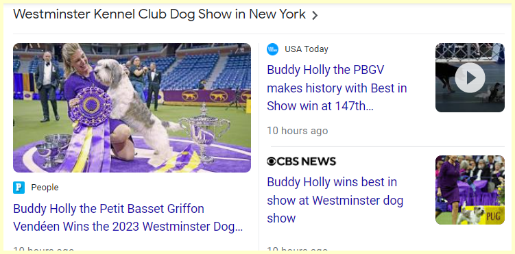 May 10, 2023 Buddy Holly the Petit Basset Griffon Vendéen Wins Best in Show at the 2023 Westminster Dog Show Buddy Holly wins for the Headlines 95 days after the death anniversary of the real Buddy Holly on May 9th 9/5 GIVE KNOWLEDGE AND SHARE THIS! Share on Facebook (Opens in new window) Facebook Share on Telegram (Opens in new window) Telegram Share on X (Opens in new window) X Like Loading... Related