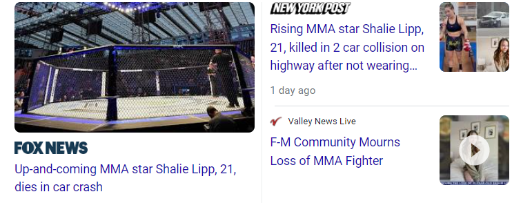 May 10, 2023 Up-and-coming MMA star Shalie Lipp, 21, dies in car crash GIVE KNOWLEDGE AND SHARE THIS! Share on Facebook (Opens in new window) Facebook Share on Telegram (Opens in new window) Telegram Share on X (Opens in new window) X Like Loading... Related