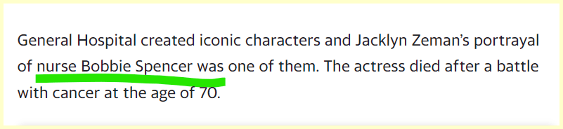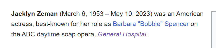 She was known as Bobbie Spencer on General Hospital