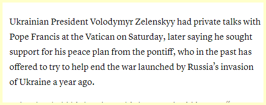 Ukrainian President Volodymyr Zelenskyy had private talks with Pope Francis at the Vatican on Saturday, later saying he sought support for his peace plan from the pontiff