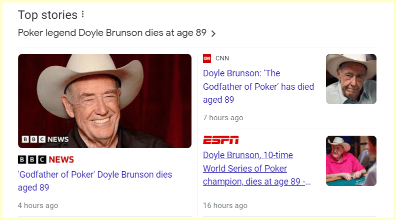 May 15, 2023 Doyle Brunson, “Godfather of Poker,” and 10-time World Series of Poker champion, dies at age 89 May 15th Headlines Died on 14th, 89 days from birthday at age of 89 GIVE KNOWLEDGE AND SHARE THIS! Click to share on Facebook (Opens in new window) Facebook Click to share on Telegram (Opens in new window) Telegram Click to share on X (Opens in new window) X Like Loading... Related