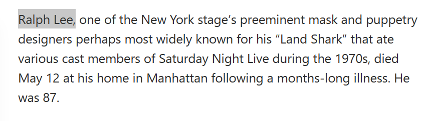 May 17, 2023May 17, 2023 Ralph Lee Dies: ‘SNL’ Land Shark Creator Was 87 They announcement is on May 13th 187 days from the first appearance of the land shark GIVE KNOWLEDGE AND SHARE THIS! Click to share on Facebook (Opens in new window) Facebook Click to share on Telegram (Opens in new window) Telegram Click to share on X (Opens in new window) X Like Loading... Related