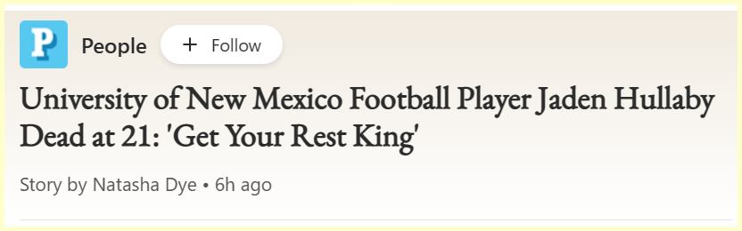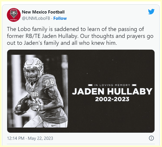 May 23, 2023May 23, 2023 JADEN HULLABY, UNM Tight End …DEAD AT 21 Another Ritual of a black man with 42 and 59. GIVE KNOWLEDGE AND SHARE THIS! Click to share on Facebook (Opens in new window) Facebook Click to share on Telegram (Opens in new window) Telegram Click to share on X (Opens in new window) X Like Loading... Related