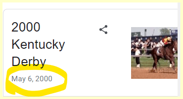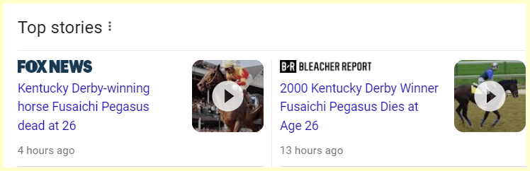 May 25, 2023May 25, 2023 2000 Kentucky Derby winner Fusaichi Pegasus dies at 26 He won the race on May 6th in 2000 written 5/6 or 6/5 Dead 17 days from the anniversary of winning the race GIVE KNOWLEDGE AND SHARE THIS! Click to share on Facebook (Opens in new window) Facebook Click to share on Telegram (Opens in new window) Telegram Click to share on X (Opens in new window) X Like Loading... Related