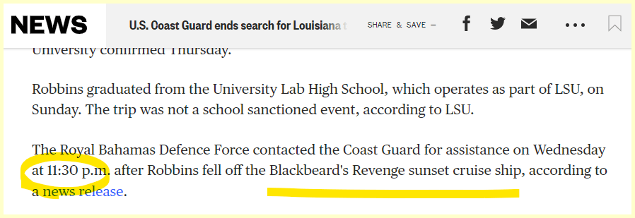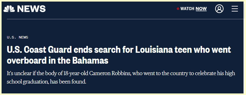 May 27, 2023 U.S. Coast Guard ends search for Louisiana teen who went overboard in the Bahamas. Lots of sacrifice numbers connected to this Headline… This occurred at 11:30. We know 113 is associated with bull$hit Matthew Spado is the spokesman for this Story. GIVE KNOWLEDGE AND SHARE THIS! Share on Facebook (Opens in new window) Facebook Share on Telegram (Opens in new window) Telegram Share on X (Opens in new window) X Like Loading... Related