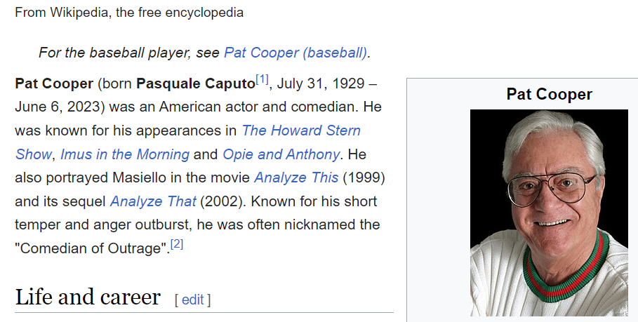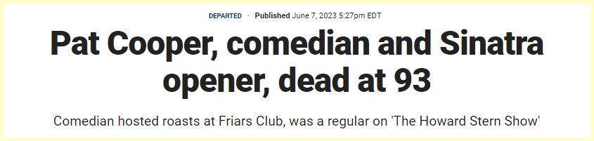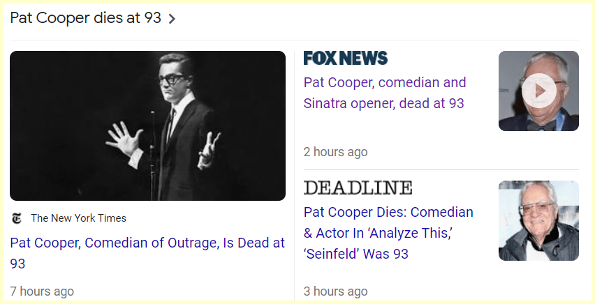 June 7, 2023 Pat Cooper Dies: Comedian & Actor In ‘Analyze This,’ Was 93 Famous for Analyze This which released on March 5th in 1999 He dies at age 93 and 93 days from the release date GIVE KNOWLEDGE AND SHARE THIS! Click to share on Facebook (Opens in new window) Facebook Click to share on Telegram (Opens in new window) Telegram Click to share on X (Opens in new window) X Like Loading... Related