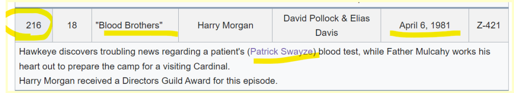 He appeared in the M*A*S*H episode “Blood Brothers” in 1981 as Private Sturgis, whose wounds are minor, but who is found to be terminally ill with cancer.
