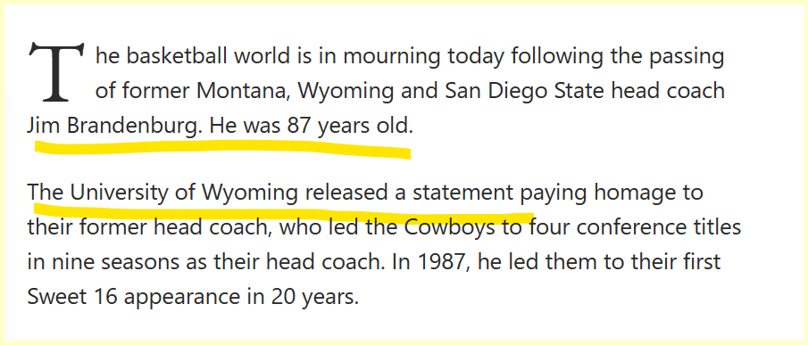 June 19, 2023June 19, 2023 Former Wyoming head coach Jim Brandenburg dies 87 years old. Dead 191 days from his last b-day and 174 until his next one. Announced June 19th GIVE KNOWLEDGE AND SHARE THIS! Click to share on Facebook (Opens in new window) Facebook Click to share on Telegram (Opens in new window) Telegram Click to share on X (Opens in new window) X Like Loading... Related