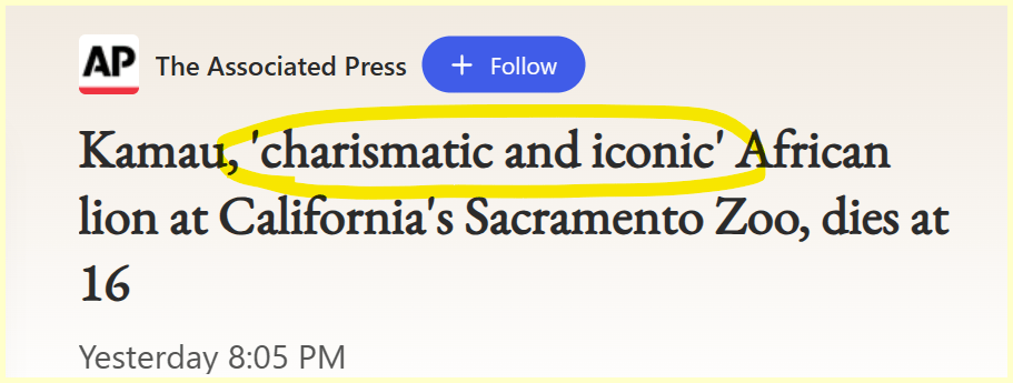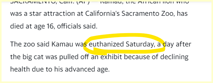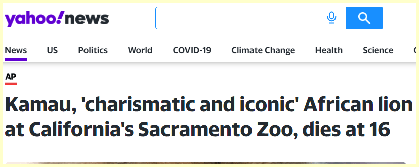 June 19, 2023 Kamau, ‘charismatic and iconic’ African lion at California’s Sacramento Zoo, dies at 16 Euthanized on Saturday June 17th 17/6 GIVE KNOWLEDGE AND SHARE THIS! Click to share on Facebook (Opens in new window) Facebook Click to share on Telegram (Opens in new window) Telegram Click to share on X (Opens in new window) X Like Loading... Related
