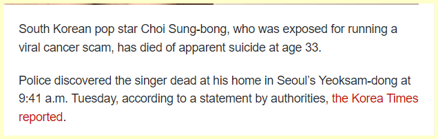 South Korean pop star Choi Sung-bong, who was exposed for running a viral cancer scam, has died of apparent suicide at age 33