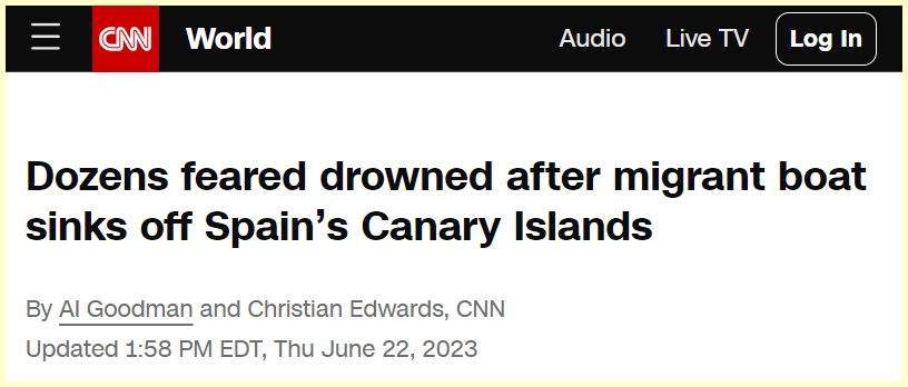 June 23, 2023 Dozens feared drowned after migrant boat sinks off Spain’s Canary Islands GIVE KNOWLEDGE AND SHARE THIS! Click to share on Facebook (Opens in new window) Facebook Click to share on Telegram (Opens in new window) Telegram Click to share on X (Opens in new window) X Like Loading... Related