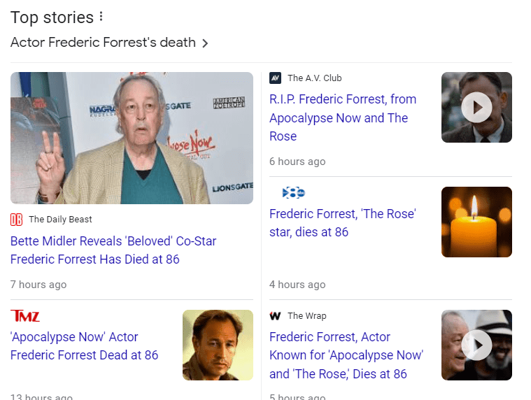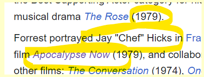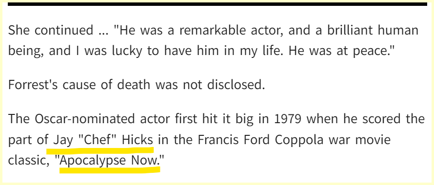 The film featuring Forrest in a key role was Francis Ford Coppola’s war film Apocalypse Now. In the movie, he played Jay “Chef” Hicks,