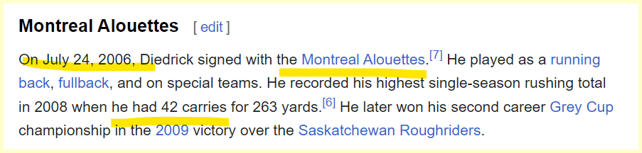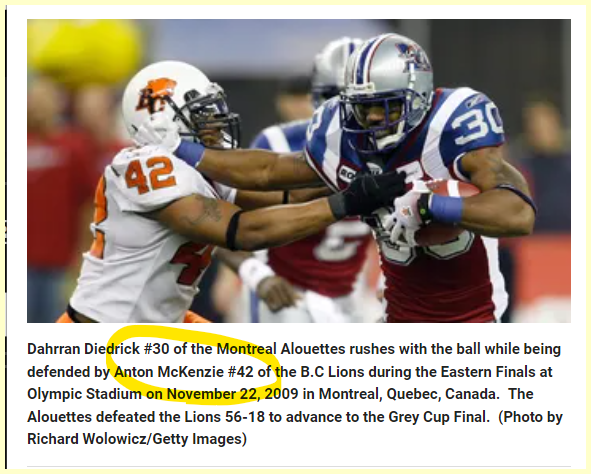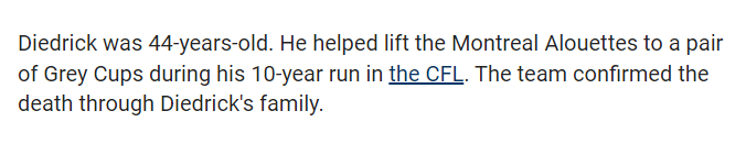 42 carries and died 30 days from anniversary of signing with the Alouettes.