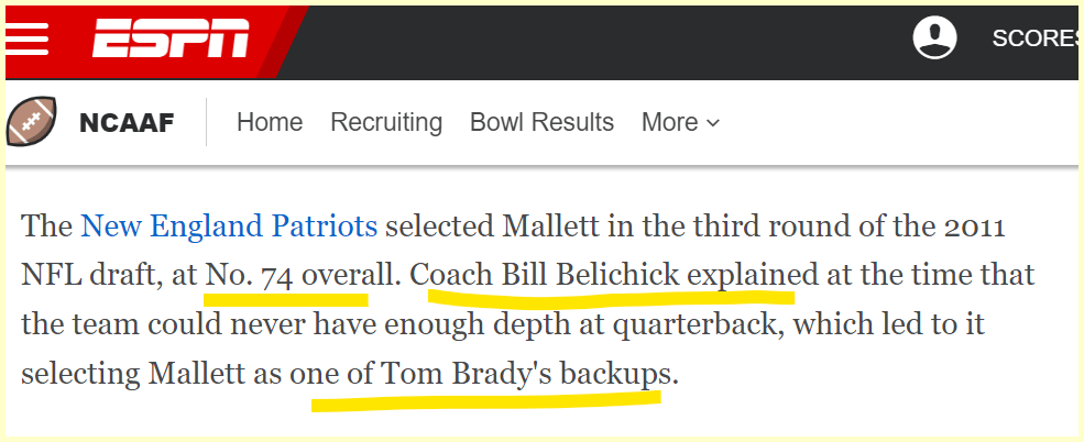 Brady was born on Aug 3 …8/3 or 3/8 …and Mallett is dead 38 days from his birthday.