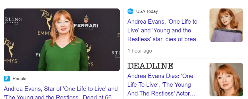 July 10, 2023 Andrea Evans, Star of ‘One Life to Live’ and ‘The Young and the Restless’, Dead at 66 Here is my post warning of Sacrifice Headlines today She died on 7/9 but they announce it on 10/7 GIVE KNOWLEDGE AND SHARE THIS! Click to share on Facebook (Opens in new window) Facebook Click to share on Telegram (Opens in new window) Telegram Click to share on X (Opens in new window) X Like Loading... Related