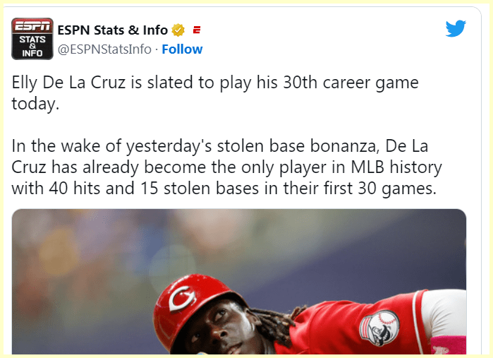 July 11, 2023 Cincinnati Reds Youngster Elly De La Cruz Has Stat Line Through 30 Games That No Player Has Ever Replicated GIVE KNOWLEDGE AND SHARE THIS! Click to share on Facebook (Opens in new window) Facebook Click to share on Telegram (Opens in new window) Telegram Click to share on X (Opens in new window) X Like Loading... Related