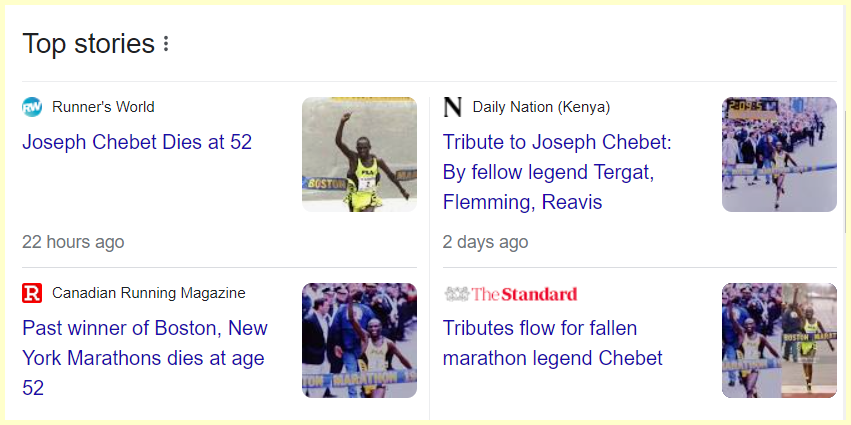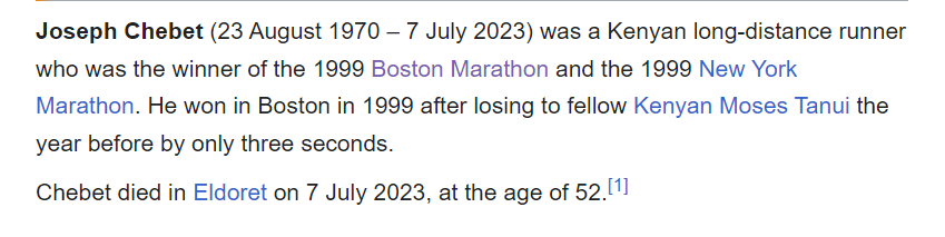 July 13, 2023 Joseph Chebet, 1999 Boston and New York City Marathon Winner, Dies at 52 Made his Fame with the Boston Marathon and died on 7/7 Dead 79 days from the anniversary of the Race that made his fame. GIVE KNOWLEDGE AND SHARE THIS! Click to share on Facebook (Opens in new window) Facebook Click to share on Telegram (Opens in new window) Telegram Click to share on X (Opens in new window) X Like Loading... Related