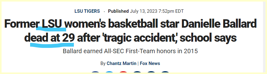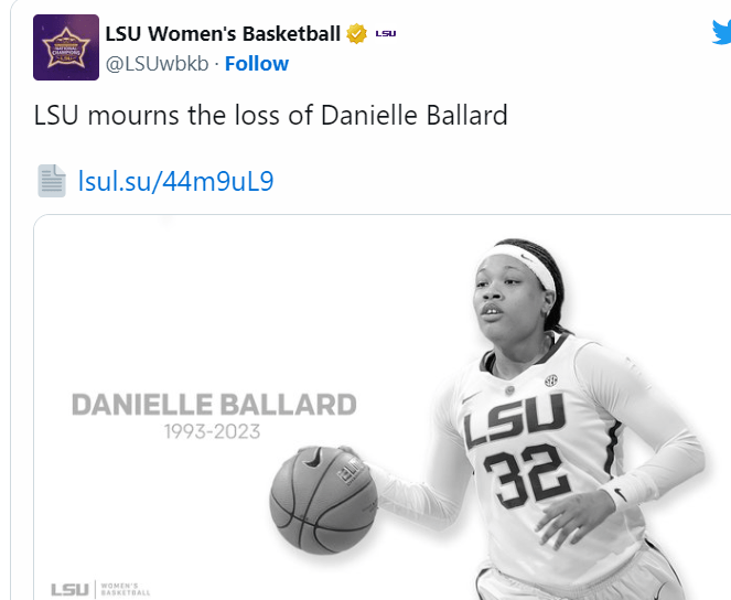 July 14, 2023 Former LSU player Danielle Ballard dies at 29 after being hit by a car GIVE KNOWLEDGE AND SHARE THIS! Click to share on Facebook (Opens in new window) Facebook Click to share on Telegram (Opens in new window) Telegram Click to share on X (Opens in new window) X Like Loading... Related