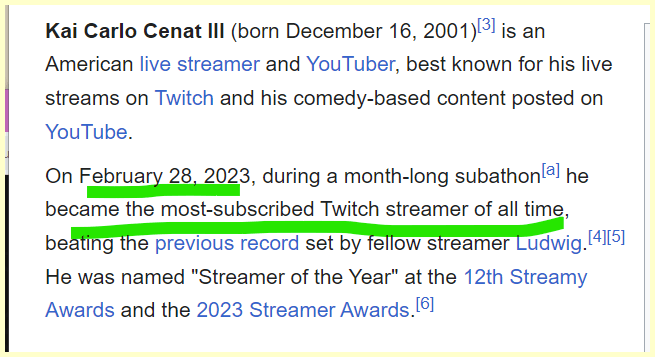 On February 28, 2023, he became the most-subscribed Twitch streamer of all time