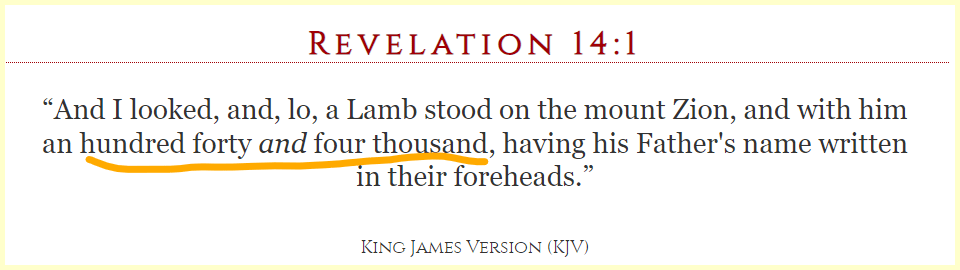 Revelation 14:1 speaks of “one hundred and forty-four thousand” standing with a Lamb on Mount Zion and having the name of God “written on their foreheads.”