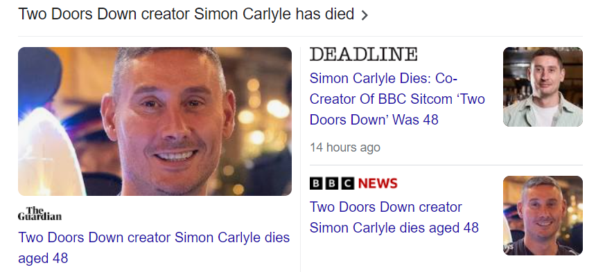 August 10, 2023 Simon Carlyle Dies: Co-Creator Of BBC Sitcom ‘Two Doors Down’ Was 48 Death announced on Aug 10th. 223 days from the release date GIVE KNOWLEDGE AND SHARE THIS! Click to share on Facebook (Opens in new window) Facebook Click to share on Telegram (Opens in new window) Telegram Click to share on X (Opens in new window) X Like Loading... Related