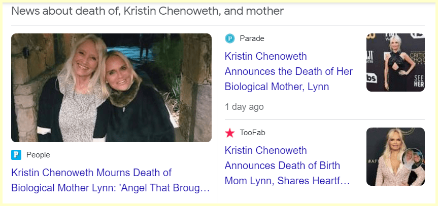 August 20, 2023August 20, 2023 Kristin Chenoweth is mourning the death of her biological mother, whom she first met in 2012 at the age of 44 She posted she met her mom on 12/12/12 and Her mom is dead 115 days from that meeting. GIVE KNOWLEDGE AND SHARE THIS! Click to share on Facebook (Opens in new window) Facebook Click to share on Telegram (Opens in new window) Telegram Click to share on X (Opens in new window) X Like Loading... Related