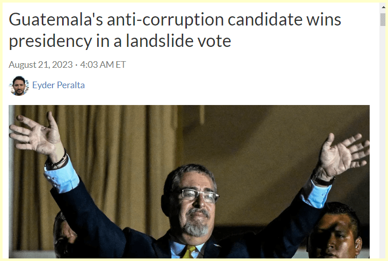 August 21, 2023August 21, 2023 Guatemala’s anti-corruption candidate wins presidency in a landslide vote He wins 47 days before his birthday 47 is a Govt Number. GIVE KNOWLEDGE AND SHARE THIS! Click to share on Facebook (Opens in new window) Facebook Click to share on Telegram (Opens in new window) Telegram Click to share on X (Opens in new window) X Like Loading... Related