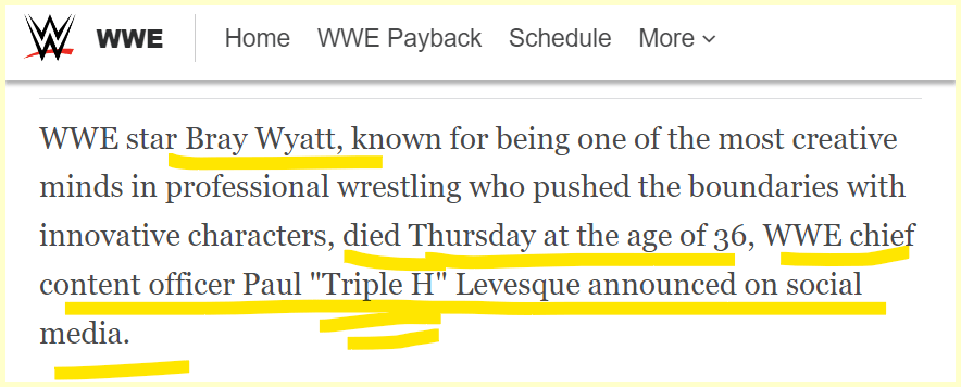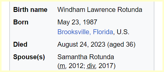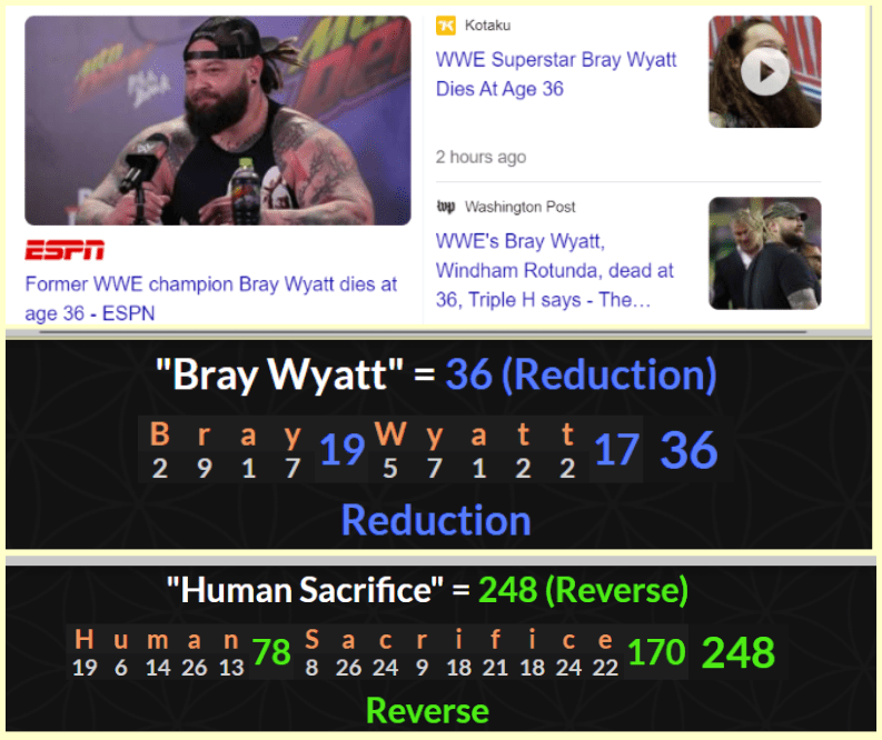 August 25, 2023August 25, 2023 Former WWE champion Bray Wyatt dies at age 36. Sacrificed 201 days from his Debut anniversary. He Debuted on the 36th day of the year and dies at age 36 Dead 201 days from his Debut Anniversary GIVE KNOWLEDGE AND SHARE THIS! Click to share on Facebook (Opens in new window) Facebook Click to share on Telegram (Opens in new window) Telegram Click to share on X (Opens in new window) X Like Loading... Related