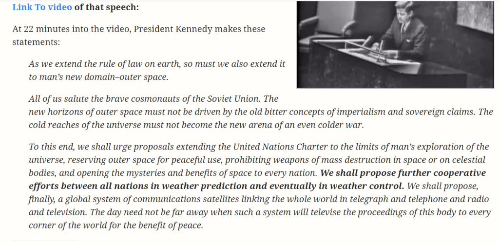 In 1952, Kennedy admitted to Weather Control. He gave a speech on Aug 25th 1961 stating