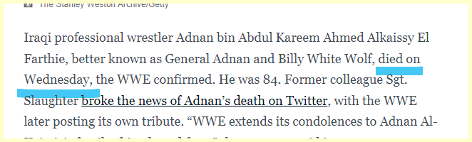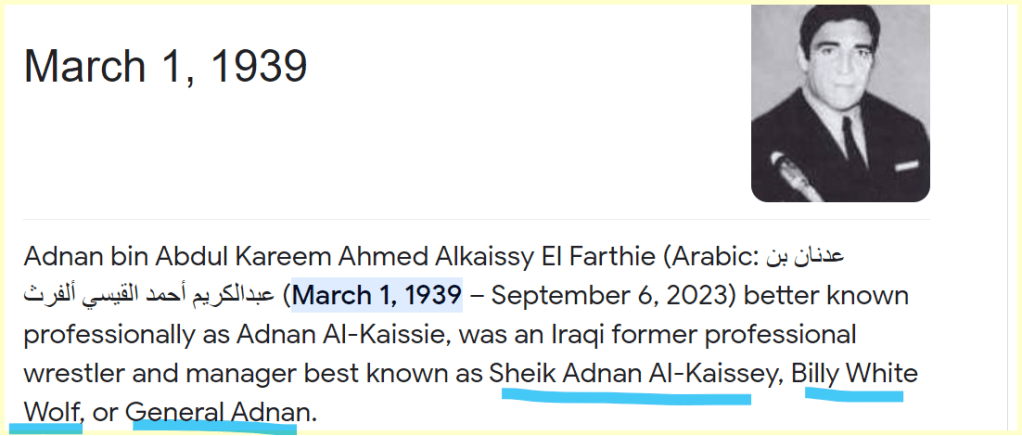 September 8, 2023 Iron Sheik’s Wrestling Partner General Adnan Dead at 84 Dies on Sept 6th 9/6 He died 177 days from his birthday GIVE KNOWLEDGE AND SHARE THIS! Click to share on Facebook (Opens in new window) Facebook Click to share on Telegram (Opens in new window) Telegram Click to share on X (Opens in new window) X Like Loading... Related