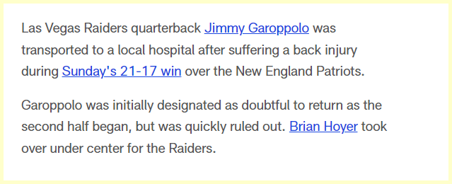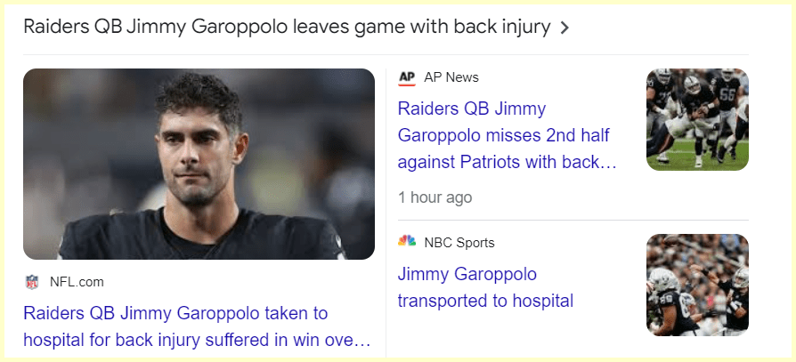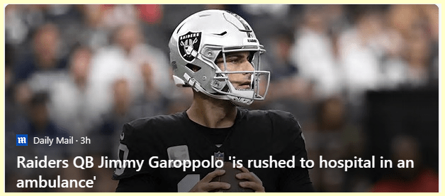 October 15, 2023October 15, 2023 “Jimmy G” Leaves Raiders game in Ambulance. The Perfect Puppet for today’s chaos. 10/15 GIVE KNOWLEDGE AND SHARE THIS! Click to share on Facebook (Opens in new window) Facebook Click to share on Telegram (Opens in new window) Telegram Click to share on X (Opens in new window) X Like Loading... Related