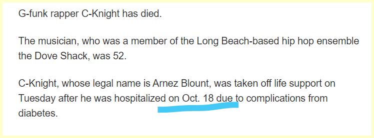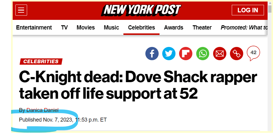 November 8, 2023 C-Knight dead: Dove Shack rapper taken off life support at 52 GIVE KNOWLEDGE AND SHARE THIS! Click to share on Facebook (Opens in new window) Facebook Click to share on Telegram (Opens in new window) Telegram Click to share on X (Opens in new window) X Like Loading... Related