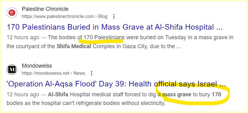 November 14, 2023November 14, 2023 170 Palestinians Buried in Mass Grave at Al-Shifa Hospital. 170 is a number we teach for death and sacrifice. This comes 38 days after the War started GIVE KNOWLEDGE AND SHARE THIS! Click to share on Facebook (Opens in new window) Facebook Click to share on Telegram (Opens in new window) Telegram Click to share on X (Opens in new window) X Like Loading... Related