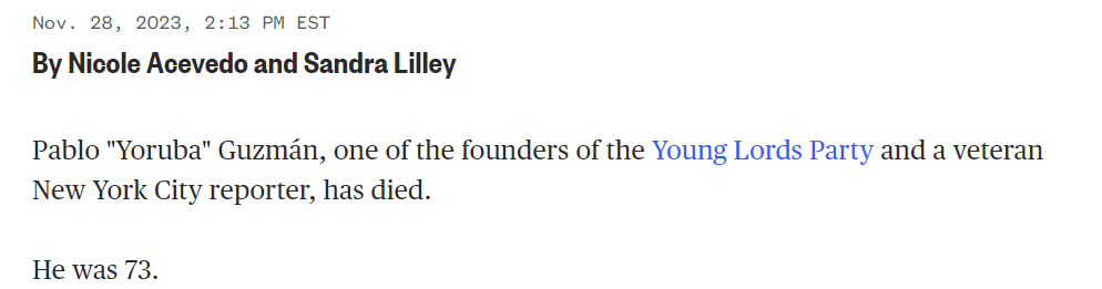 November 28, 2023November 29, 2023 Pablo Guzmán, Young Lords co-founder and longtime TV reporter, dies at 73 GIVE KNOWLEDGE AND SHARE THIS! Click to share on Facebook (Opens in new window) Facebook Click to share on Telegram (Opens in new window) Telegram Click to share on X (Opens in new window) X Like Loading... Related