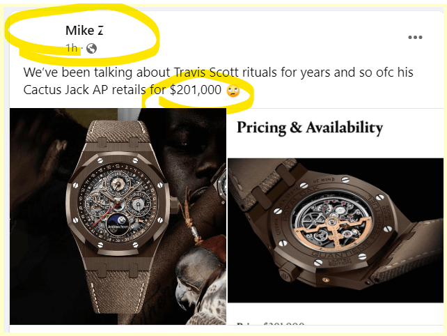 December 10, 2023 Travis Scott sells limited watch for 201,000 dollars. Shout out to Mike Z for this find This watch was announced on Nov 30th, 153 days before Scott’s 33rd Birthday GIVE KNOWLEDGE AND SHARE THIS! Click to share on Facebook (Opens in new window) Facebook Click to share on Telegram (Opens in new window) Telegram Click to share on X (Opens in new window) X Like Loading... Related
