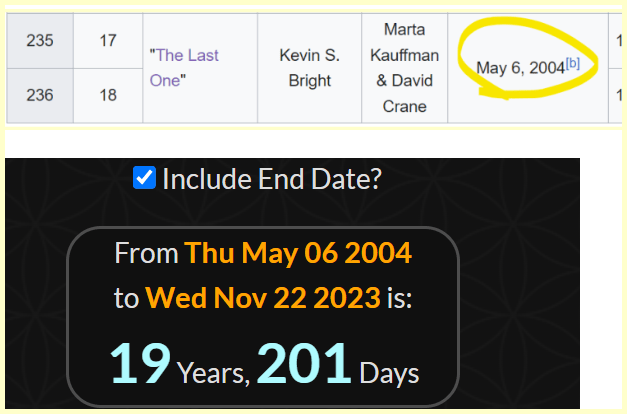 The last episode of friends aired on May 6th 2004 19 years and 201 days before the release of the film.