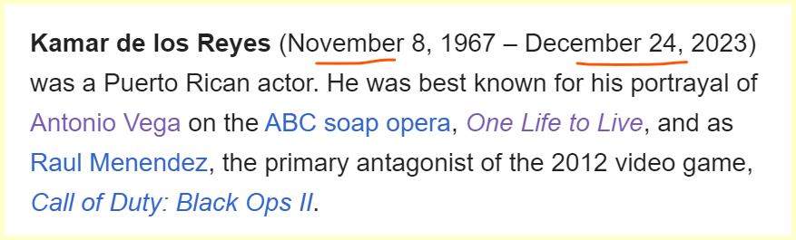 December 28, 2023 One Life to Live, Kamar de los Reyes, dead age 56 Dead 46 days from his birthday He debuted on the 174th day of the year. 10/7, July 10th. This show aired for 43 years. GIVE KNOWLEDGE AND SHARE THIS! Click to share on Facebook (Opens in new window) Facebook Click to share on Telegram (Opens in new window) Telegram Click to share on X (Opens in new window) X Like Loading... Related