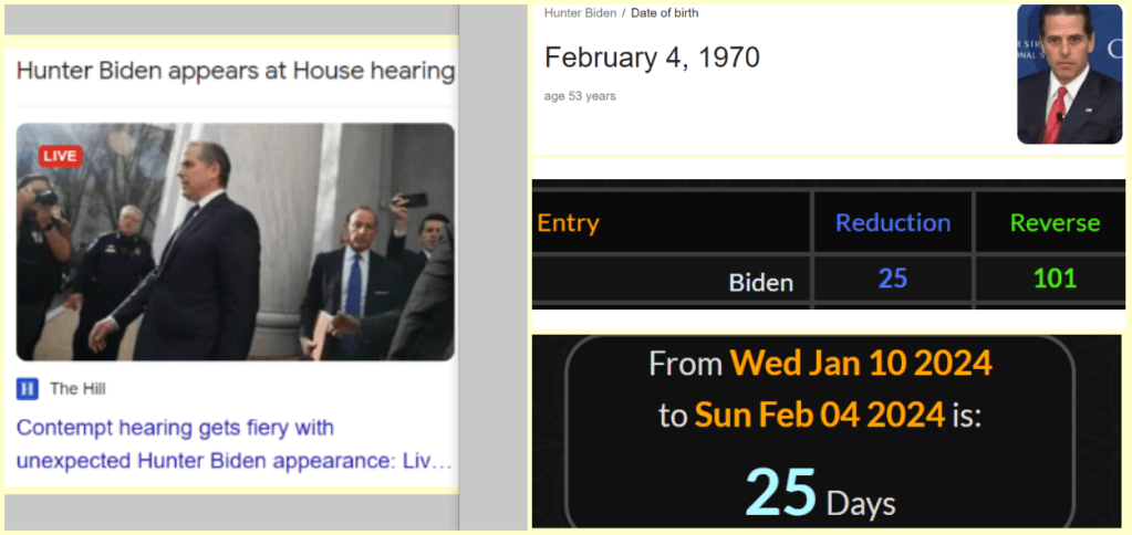 January 10, 2024 Biden makes surprise appearance at House hearing, Jan 10th, 2024. 25 days before his birthday on 10/1 GIVE KNOWLEDGE AND SHARE THIS! Click to share on Facebook (Opens in new window) Facebook Click to share on Telegram (Opens in new window) Telegram Click to share on X (Opens in new window) X Like Loading... Related