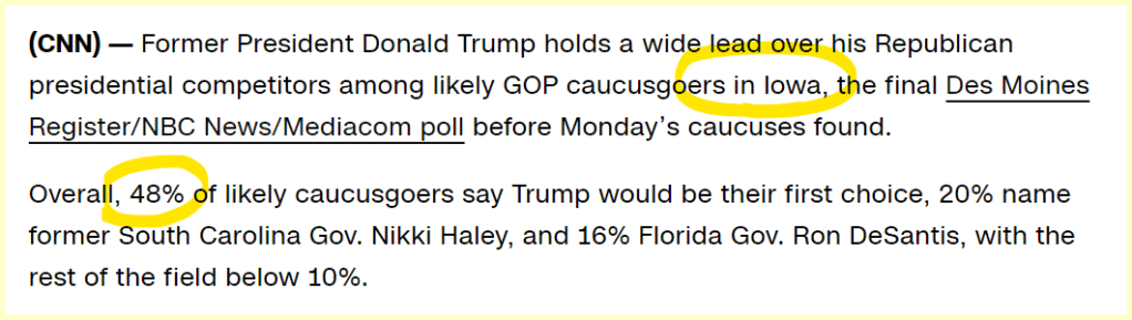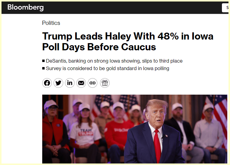 January 13, 2024January 15, 2024 Trump holds 48% lead over GOP field ahead of Iowa caucuses GIVE KNOWLEDGE AND SHARE THIS! Click to share on Facebook (Opens in new window) Facebook Click to share on Telegram (Opens in new window) Telegram Click to share on X (Opens in new window) X Like Loading... Related