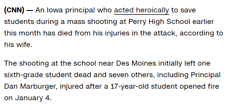 January 15, 2024January 15, 2024 Iowa principal who was hailed a hero in Perry High School shooting dies of injuries Principal died 223 / 144 days from his birthday. This is the pattern we teach about often GIVE KNOWLEDGE AND SHARE THIS! Click to share on Facebook (Opens in new window) Facebook Click to share on Telegram (Opens in new window) Telegram Click to share on X (Opens in new window) X Like Loading... Related