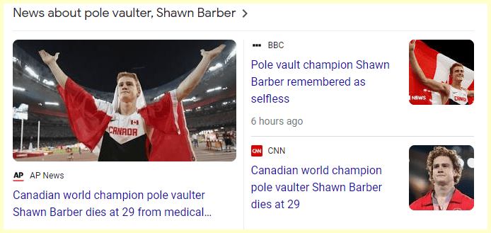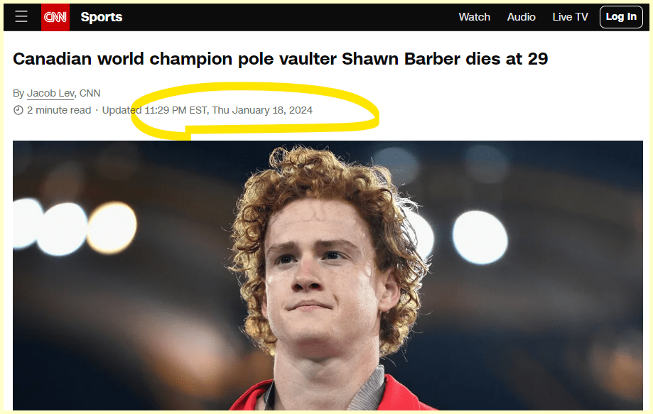 January 19, 2024 Canadian world champion pole vaulter Shawn Barber dies at 29 Dead on Jan 17th Death Headlines comes 130 days from his birthday. He died on the 17th for the 18th Headlines. GIVE KNOWLEDGE AND SHARE THIS! Click to share on Facebook (Opens in new window) Facebook Click to share on Telegram (Opens in new window) Telegram Click to share on X (Opens in new window) X Like Loading... Related