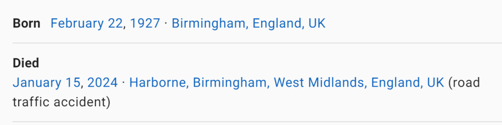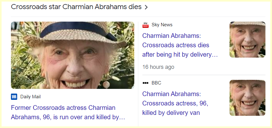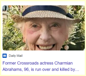 January 20, 2024 Charmian Abrahams: Crossroads actress, 96, killed by delivery van She is killed 38 days from her birthday She died 38 days from her 97th birthday GIVE KNOWLEDGE AND SHARE THIS! Click to share on Facebook (Opens in new window) Facebook Click to share on Telegram (Opens in new window) Telegram Click to share on X (Opens in new window) X Like Loading... Related