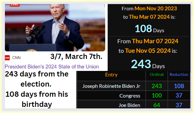March 7, 2024March 7, 2024 State of the Union, March 7th 2024. 243 days from the election and 108 days from his birthday. Sharable image below. GIVE KNOWLEDGE AND SHARE THIS! Click to share on Facebook (Opens in new window) Facebook Click to share on Telegram (Opens in new window) Telegram Click to share on X (Opens in new window) X Like Loading... Related