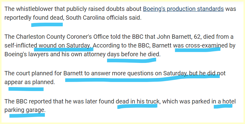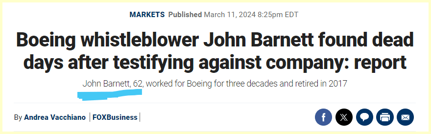 March 11, 2024March 11, 2024 Boeing whistleblower, John Barnett, found dead in his truck, days after testifying in lawsuit. Barnett is dead at age 62. Died on the murder date GIVE KNOWLEDGE AND SHARE THIS! Click to share on Facebook (Opens in new window) Facebook Click to share on Telegram (Opens in new window) Telegram Click to share on X (Opens in new window) X Like Loading... Related