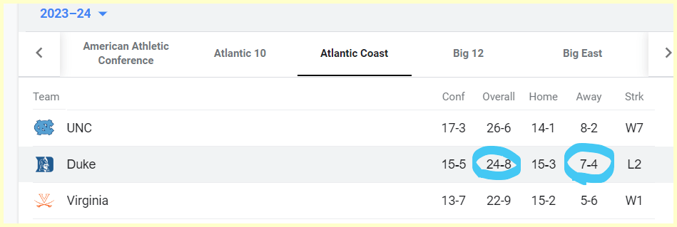Duke loses today making them 24/8 for season and 7/4 away