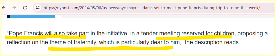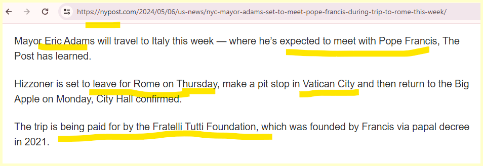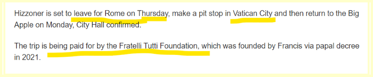 This headline comes 118 days from his birthday. The foundation paying his way is Fratelli Tutti founded by the pope.