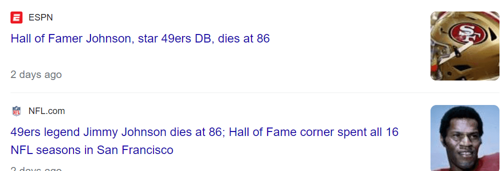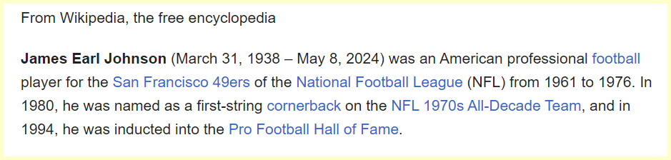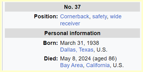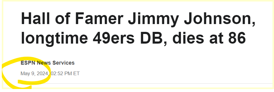 May 11, 2024 Pro Football Hall of Fame defensive back Jimmy Johnson has died. He was 86. Dead 38 days after his birthday. He died 38 days after his birthday This makes headlines on the 130th day of the year. Dead at age 86 GIVE KNOWLEDGE AND SHARE THIS! Share on Facebook (Opens in new window) Facebook Share on Telegram (Opens in new window) Telegram Share on X (Opens in new window) X Like Loading... Related